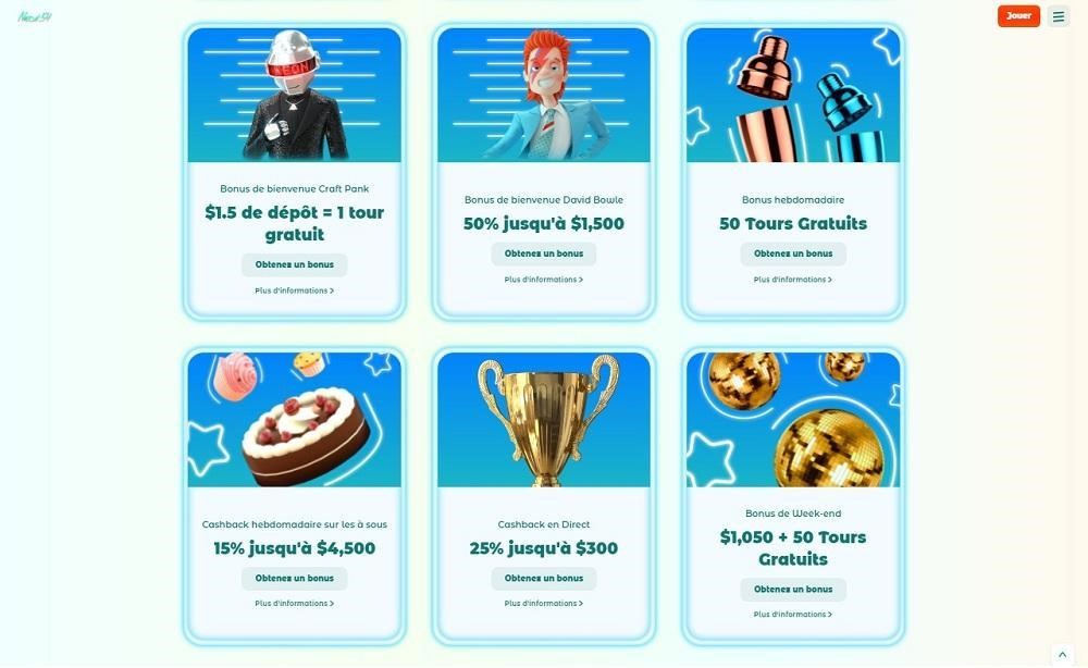 Les nouveaux joueurs de Neon54 sont accueillis de la plus belle des manières. En l’occurrence, les nouveaux inscrits peuvent choisir leurs cadeaux de bienvenue :