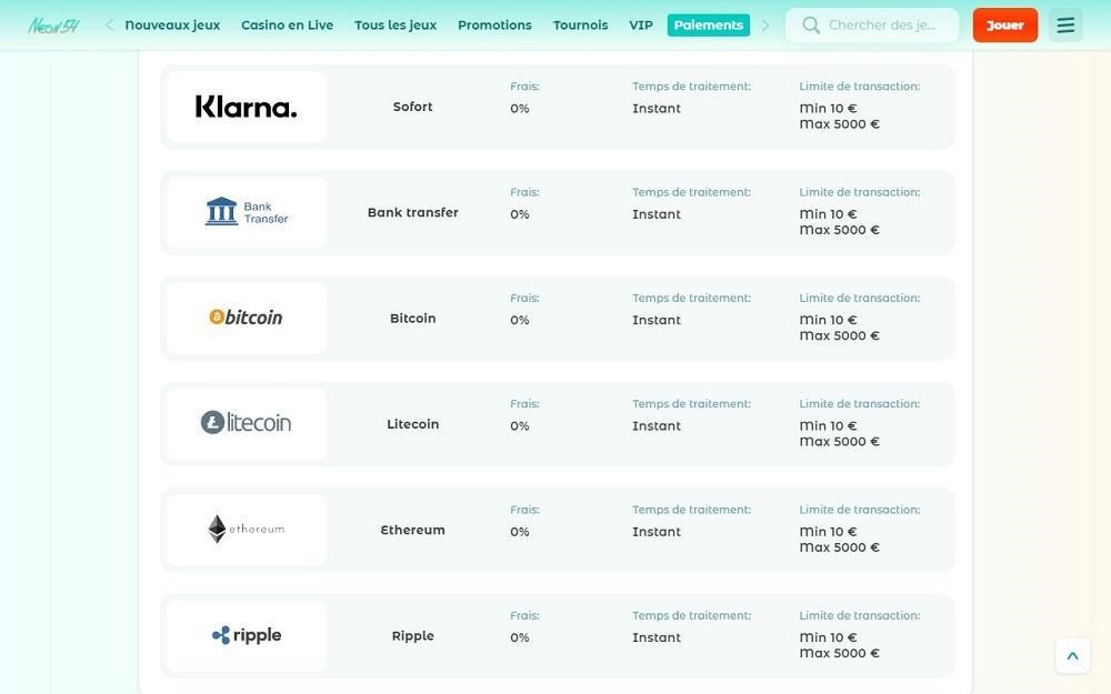 Neon54 propose de nombreux moyens de paiement afin de satisfaire aux habitudes des joueurs. En ce sens, il accepte les modes de paiement traditionnels par cartes bancaires tels que Visa et MasterCard . En outre, les joueurs peuvent également utiliser des portefeuilles électroniques (Neteller, eZee wallet…). La durée du retrait peut varier de 24h à 3 jours selon la méthode utilisée.